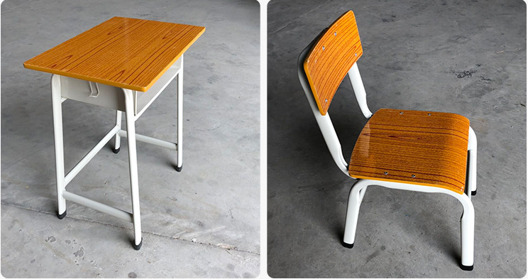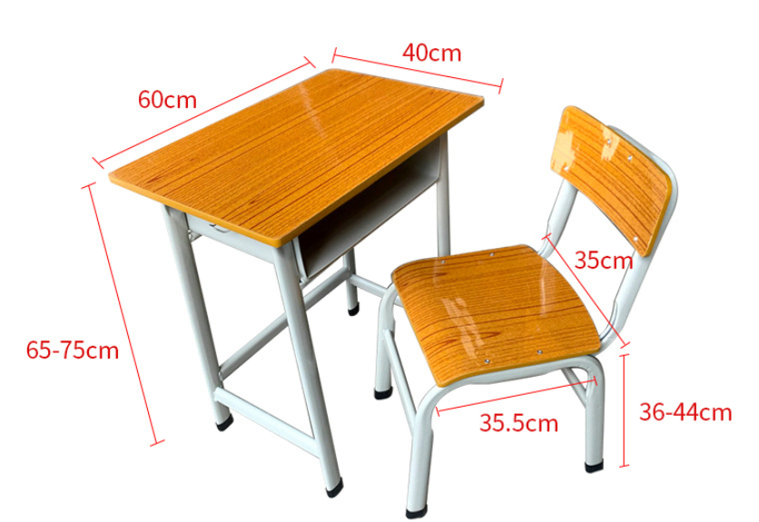 Product Name: Wooden student Desk and Chair. Material: Iron, Wood. Color: Wood colored table and chair+white table and chair legs. Style: Minimalist. Application: Classroom, training room, etc.
