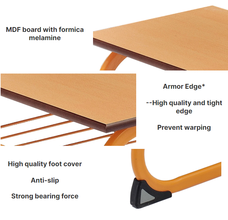As a professional school furniture manufacturer, we are committed to providing excellent quality and customer satisfaction services. Our desks and chairs have undergone rigorous testing to ensure they meet the highest standards of durability, safety, and functionality. We also offer customized options to match your classroom decor. Please contact us immediately to discuss your needs. 【Product description】 Desk Size: 600L*400W*760 mm Chair Size:400*380*780 mm Desktop: HDF/MDF