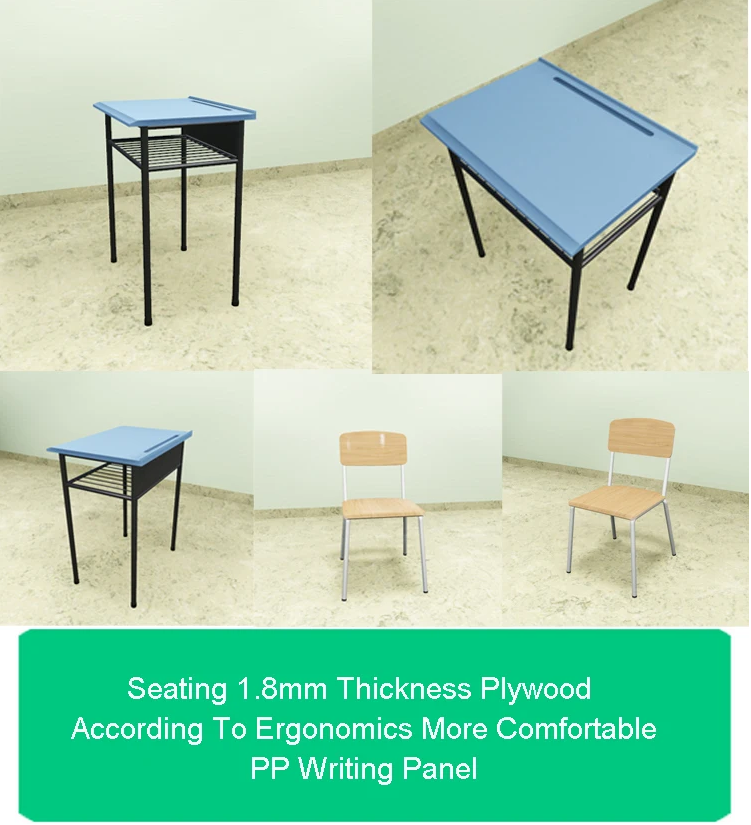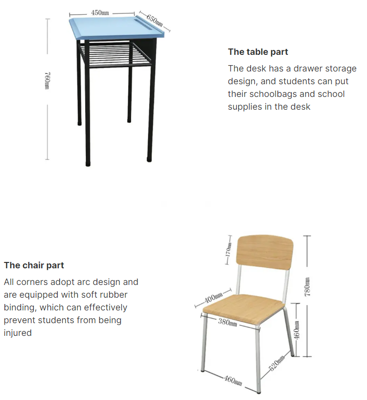 1: Alibaba's strong merchants: The company has 25 years of production and export experience, with a factory area of 11500 square meters. The annual output can reach one million sets of desks and chairs. 2: Our own 8000 square meter warehouse: regular school furniture products can be shipped at any time, with fast supply and timely delivery. 3: Qualified inspection, quality assurance: A professional management team and quality inspection specialists strictly control raw materials and finished products. 【Product Features】 1: Applicable age: 3-18 years old. 2: Protect the spine. 3: Correct sitting posture. 4: Prevent myopia. 5: Injection molding edge sealing. 6: Environmentally friendly desktop.