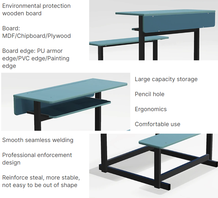 Our school desk and chairare made of sturdy and durable materials, with strong load-bearing and good stability, which can meet the various learning requirements of students in the classroom. The smooth surface is easy to write and draw, and the corners of the desks are designed with circular arcs to prevent accidental collisions and provide excellent safety protection for students. At the same time, we choose environmentally friendly materials to ensure that children can use them with peace of mind.