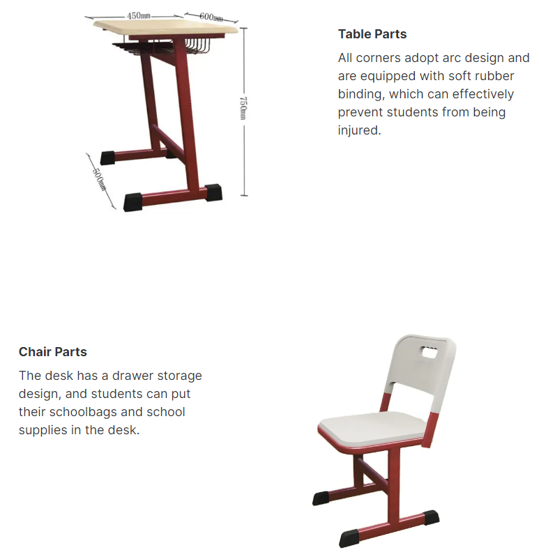 Our school desk and chair are made of sturdy and durable materials, with strong load-bearing and good stability, which can meet the various learning requirements of students in the classroom. The smooth surface is easy to write and draw, and the corners of the desks are designed with circular arcs to prevent accidental collisions and provide excellent safety protection for students. At the same time, we choose environmentally friendly materials to ensure that children can use them with peace of mind.